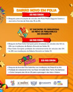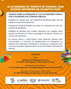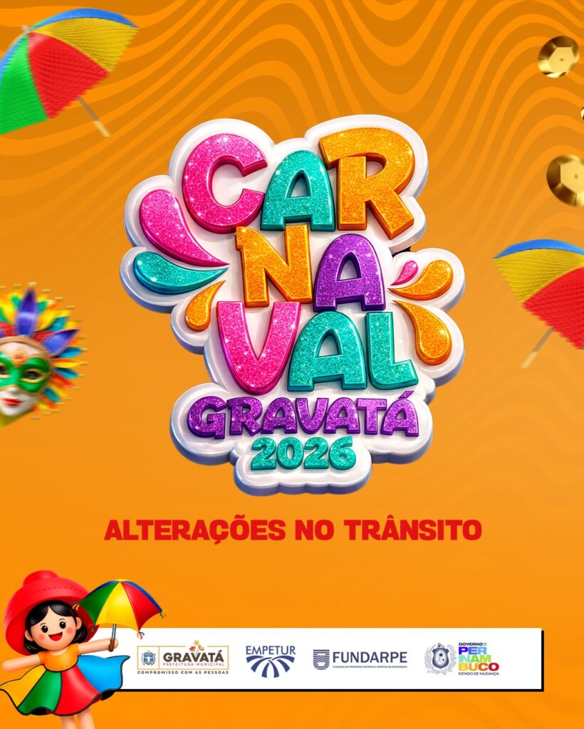 A Prefeitura de Gravatá, por meio da Secretaria de Segurança e Defesa Civil e do Departamento Municipal de Trânsito e Transporte (DMGTTrans), informa à população e visitantes sobre as alterações no trânsito e as medidas de segurança que serão adotadas durante o Carnaval 2026. As ações têm como objetivo assegurar a mobilidade urbana, a organização dos eventos e a segurança dos foliões ao longo da programação carnavalesca no município.