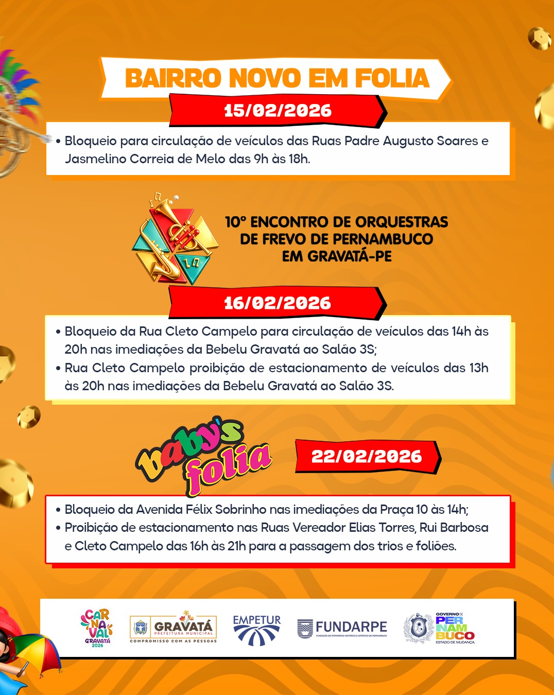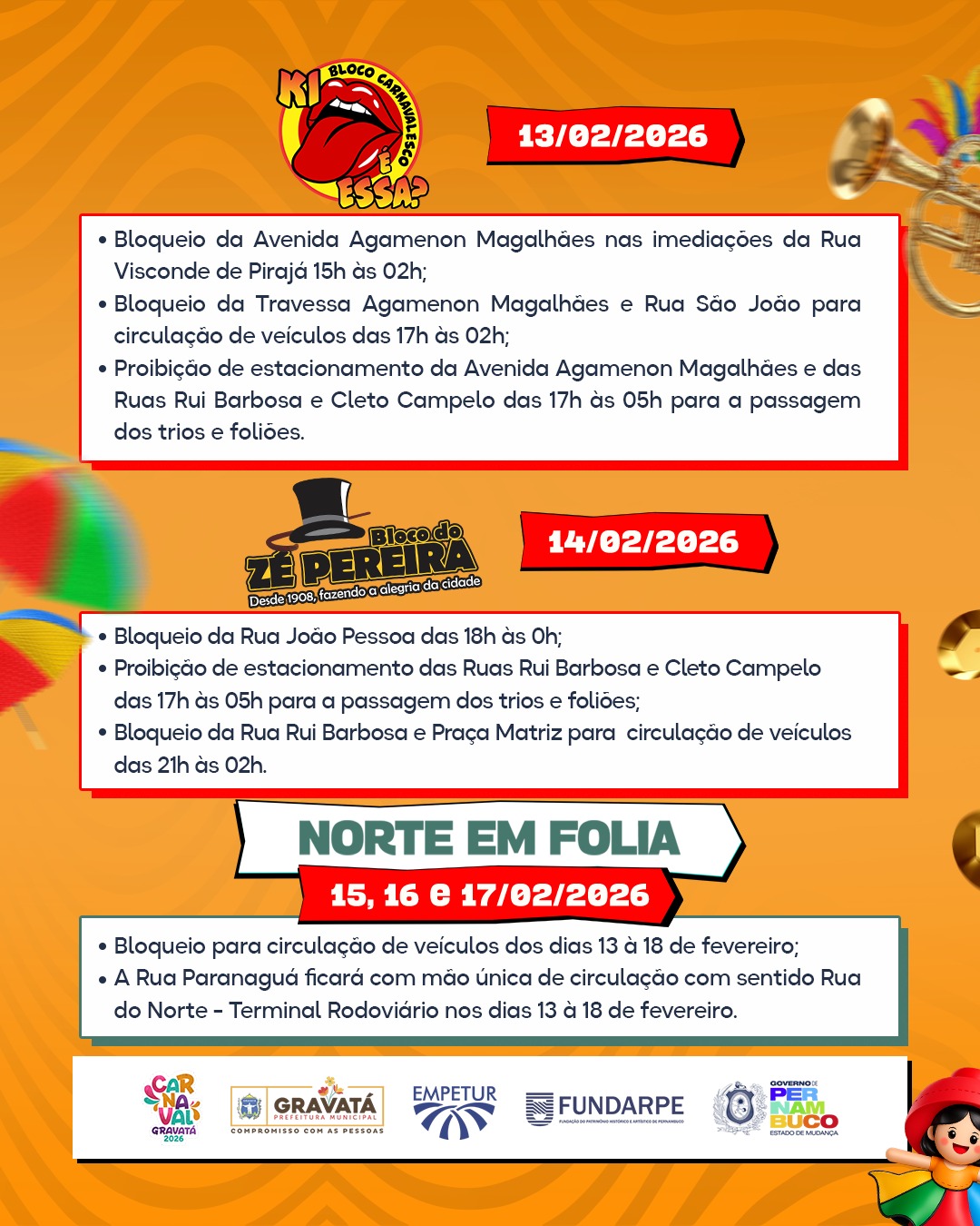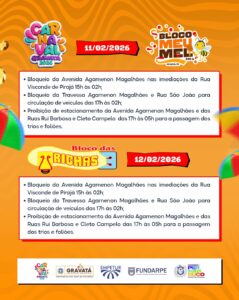 • Proibição de estacionamento das Ruas Rui Barbosa e Cleto Campelo, das 17h às 05h, para a passagem dos trios e foliões;